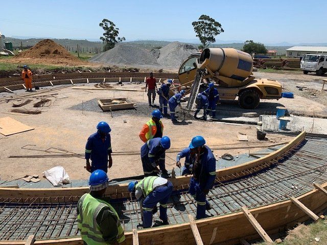As these jobsites were in varying landscapes throughout the Eastern Cape, all 4 reservoirs, as well as bases of the cleaning and filtering tanks were cast by using this incredibly versatile concrete mixer. With aggregates placed only 50m from the discharge site, what was planned to be a 10 day pour was completed in 5 days. The client was able to cast much quicker than anticipated! This was achieved by using two Carmix units of 3.5 cube capacity each, allowing one unit to cast bases for a reservoir, while the other poured thin blinding and a no-fines mixture at the next site.