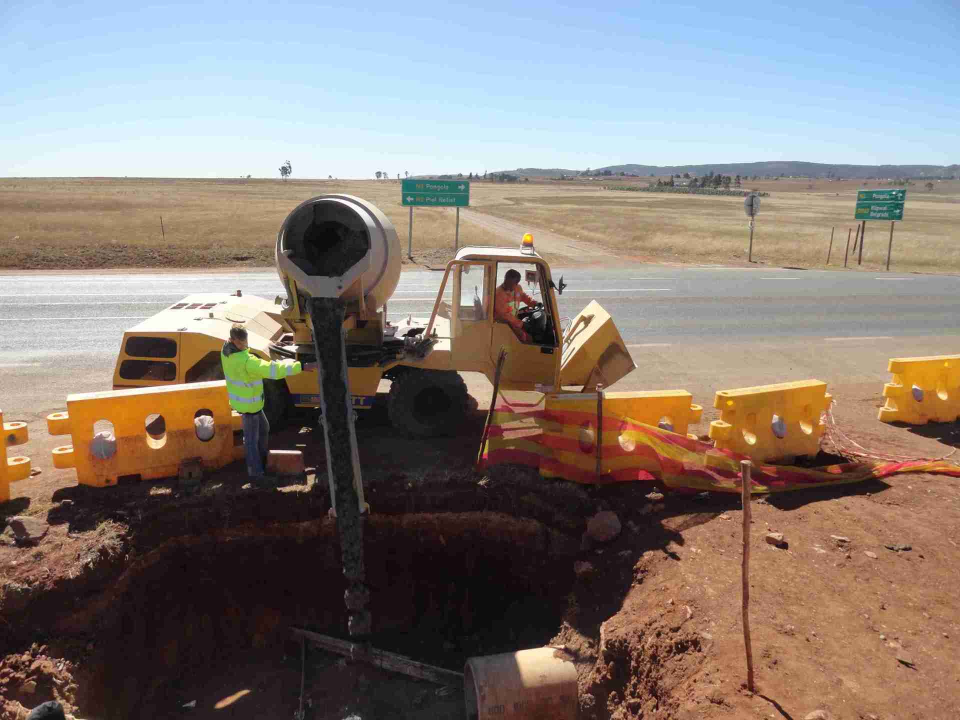 The contractor set up various stockpiles of aggregates along the road allowing a fast turn around time from mixing to discharge. Another huge advantage is the 300deg slewing of the drum allowing the unit to keep driving straight while discharging to the side. I deal for long narrow pours and to ensure high productivity levels.
