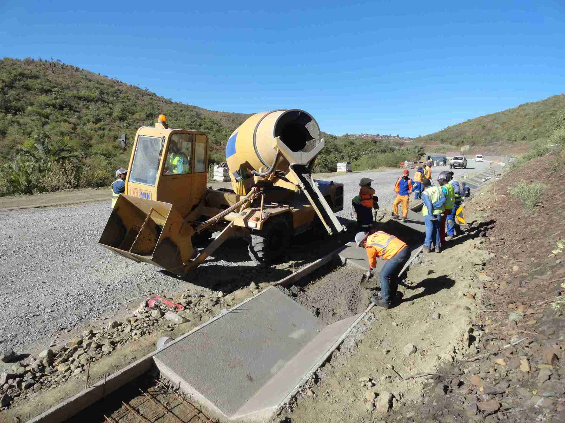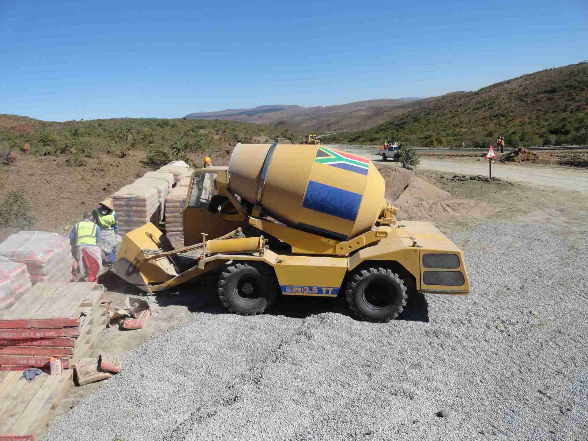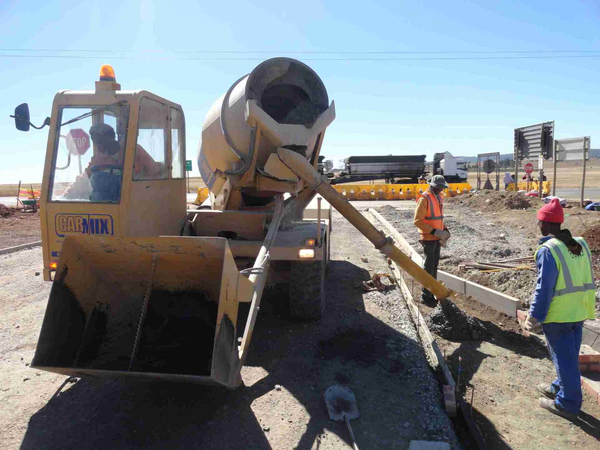 As expected when working on roads, the jobsite is spread over a number of kilometres. Therefore the discharging points are a fair distance away from the batching area. Additionally the rolling hills of Kwa-Zulu Natal can be a tough obstacle for a fully loaded concrete mixer. However the Carmix 3.5TT, with a Perkins Turbo Diesel Engine produces 111 HP allowing it to climb the hills with ease and is able to deliver concrete along the entire section of road.